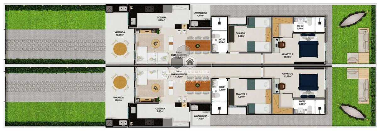 Sala de estar/jantar integrados a cozinha americana, 02 suítes (sendo 01 reversível e 01 Master), varanda gourmet, lavanderia externa, quintal privativo.