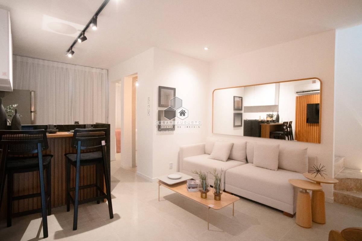Sala de estar/jantar, cozinha integrada, 01 suíte reversível, varanda gourmet, quintal privativo com área de serviço e 02 vagas.